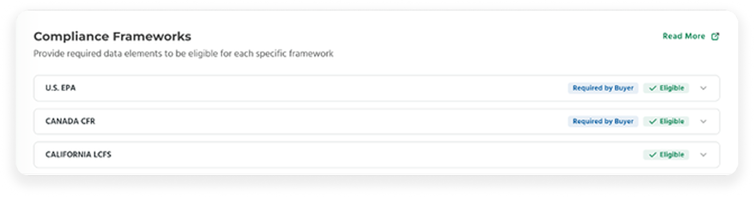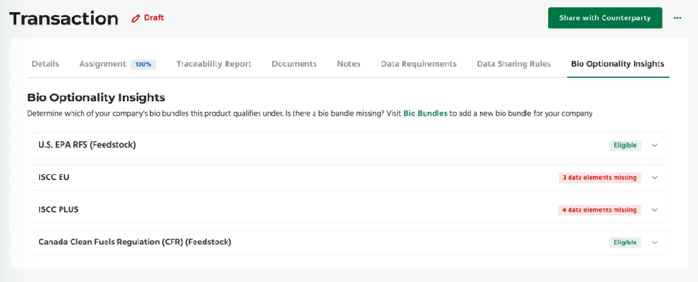 Veriflux360’s bio optionality™ tools process the data elements in a transaction and identify eligible markets and customers based on the product’s sustainability and compliance attributes. Whether you operate in regulated markets such as EPA RFS, LCFS, EU RED, and CFR, or utilize globally recognized voluntary schemes, we’ve got you covered!