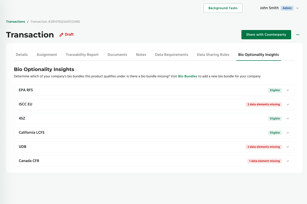 Bio Bundles help you manage compliance eligibility and flag missing data elements required for programs like EPA, LCFS, CFR and RED III.